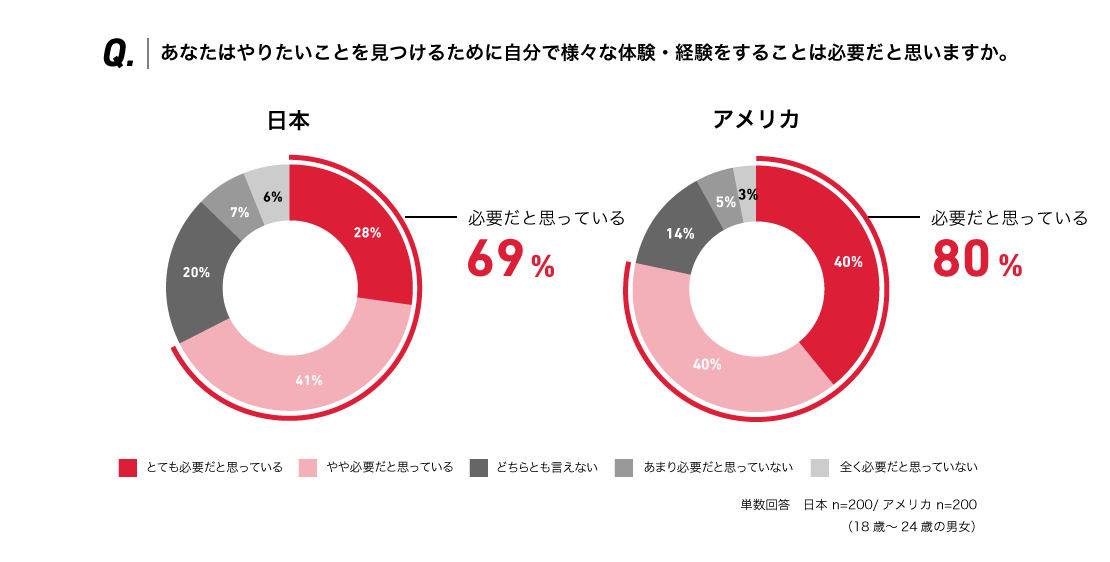 やりたいことをみつけるための体験・経験の必要性を聞いたところ、「とても必要だと思っている」「やや必要だと思っている」と回答した次世代層は、日本が69%、アメリカは80%にのぼりました。