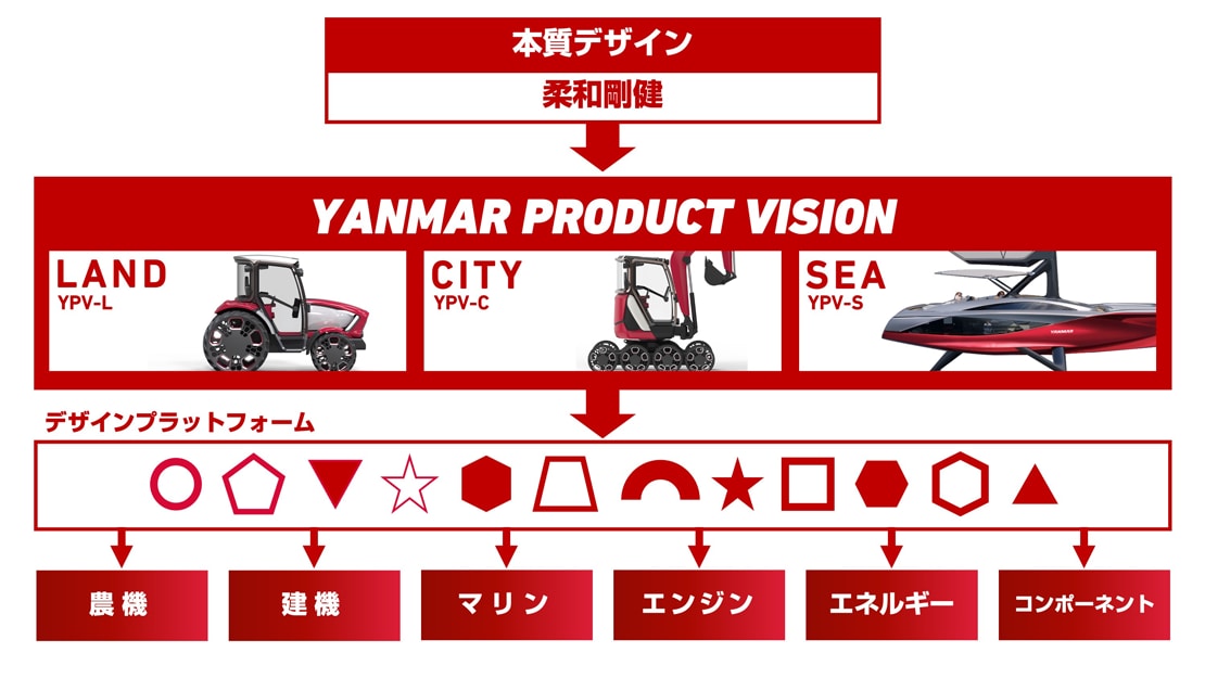 ヤンマーホールディングス株式会社(以下、ヤンマーHD)は、本来の機能的な価値・意味を重視する「本質デザイン」の思想に基づき、次世代ヤンマーデザインの“ありたき姿”を視覚化した「YANMAR PRODUCT VISION(YPV)」を発表しました。YPVから生まれたデザイン要素と、これまでヤンマーが培ってきたデザイン要素を融合したプラットフォームを構築し、農機や建機、ボートなどの製品ほか、サービスなども含めた当社のプロダクトに順次適用していきます。