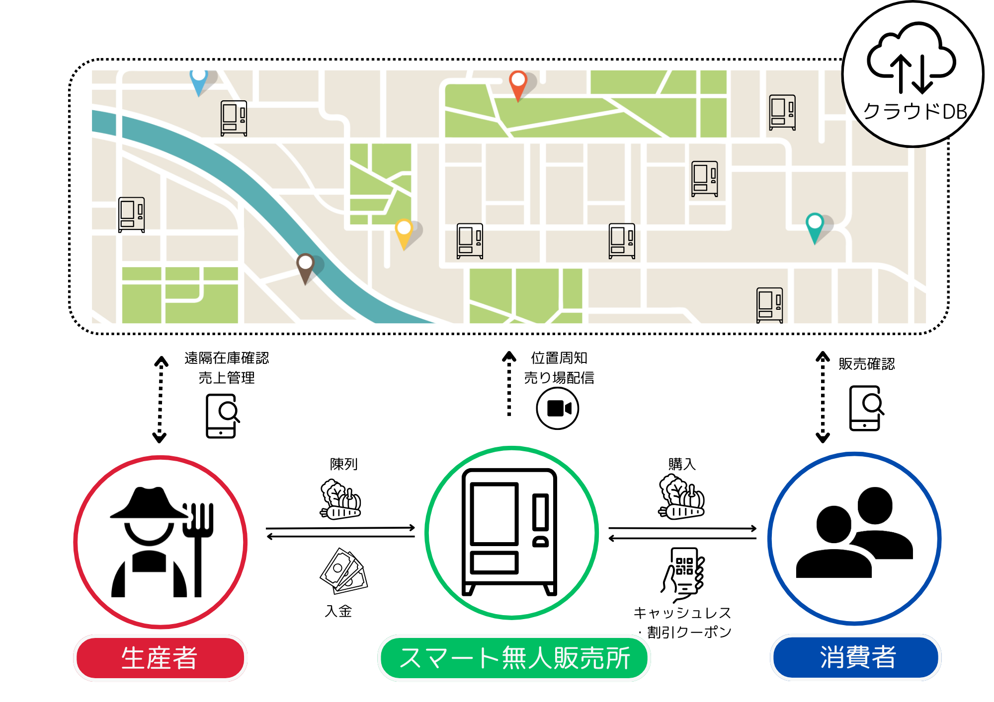 - 無人販売所は生産者・周辺消費者にとってメリットがある反面、設置に適した場所でなければ売上が見込めず、生産者にとって新規参入障壁が高いという課題があります。デジタル技術や共同販売形態の活用、好立地設置を実証実験で行うことで、あらゆる生産者が手軽に始められ、地産地消が一層活性化するモデルの構築を目指します。現在の直売所運営主体者にとっては、遠隔管理可能な共同無人販売所の新たな設置により、運営コストを抑えつつ、さらなる流通量増加が期待されます。