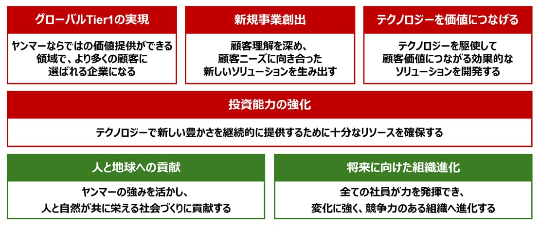 ヤンマーグループは、新たな理念のもと、最大の豊かさを最少の資源で実現するソリューションカンパニーとして、既存事業の成長に加え、新たな顧客価値につながる新規事業の創出、技術開発に取り組み、強固な経営基盤を構築し、人と自然への貢献を目指します。