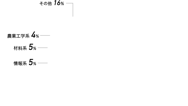 内訳 - 社会学系 2%、生物系 2%、農業経済系 2%、文学系 2%、国際系(リベラルアーツ) 2%、機械・電気、生物系 2%、環境工学、エネルギー工学 2%、外国語系 2%