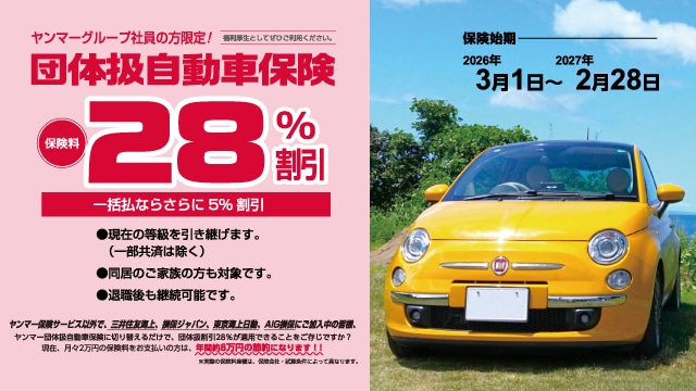 - ※大口団体割増引率は、ヤンマーグループ団体扱自動車保険の「ご契約台数」と「損害率」に応じて毎年算出され変動する場合があります。大口団体割引28%は、ご契約期間の初日が2026年3月1日から2027年2月28日までのご契約に適用されます。