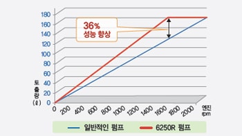 엔진 1,600rpm부터 최대 토출량 공급하며, 기존 모델 대비 최대 36% 성능이 향상되어 어떤 작업기에도 여유롭게 유량 공급