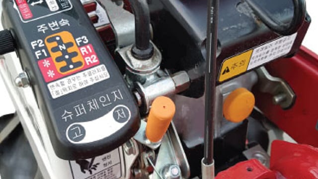작업속도 및 로터리속도를 레버 하나로 동시에 변경 가능 레버하나로 구동벨트를 전환하는 부변속 슈퍼체인지를 채용.