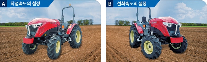 예를들면 인접 경운작업으로 논머리선회시 [A]에는 작업속도, [B]에는 선회속도를 설정. [A ↔ B자동절환]을 사용하면 안심. 에너지절약이 가능합니다.