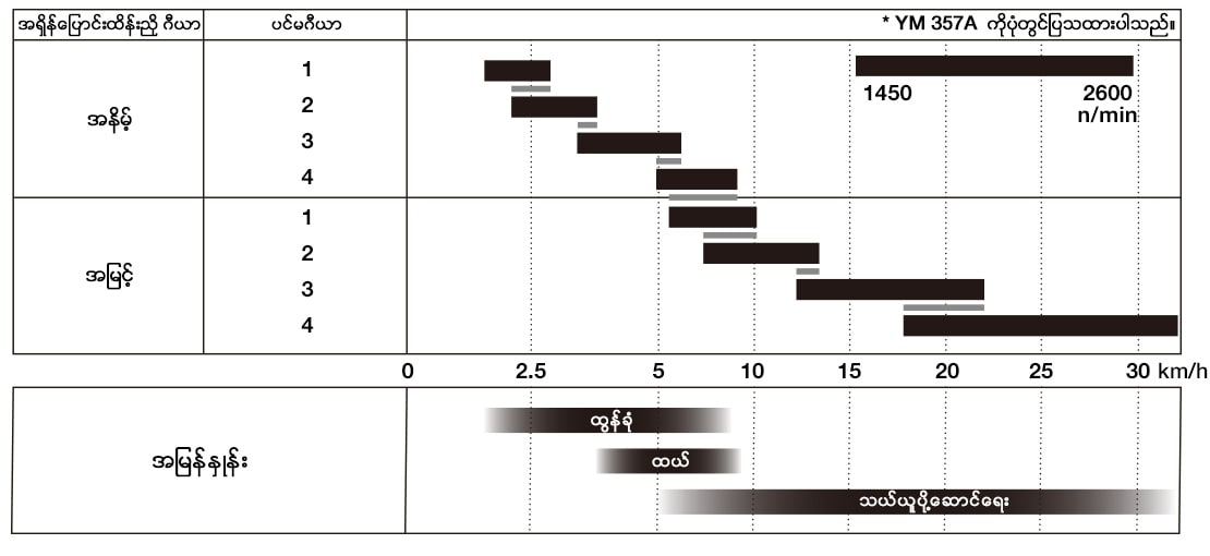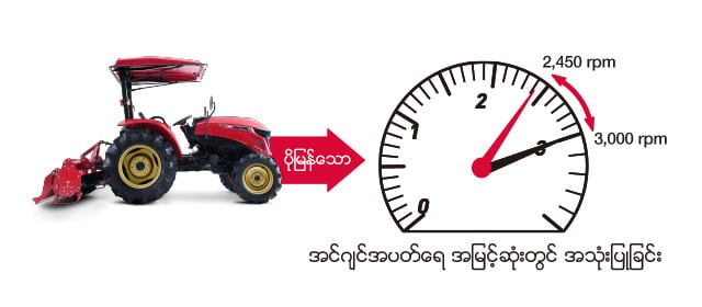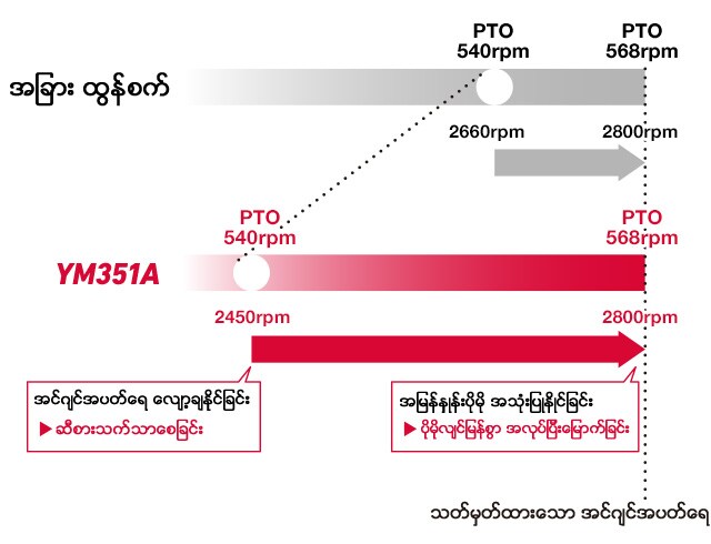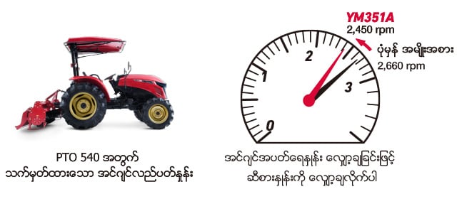 YM ထွန်စက် အမျိုးအစားတွင် အင်ဂျင်အပတ်ရေ အနည်းဆုံးဖြင့် PTO အမြန်နှုန်း ၅၄၀ RPM ကို ရရှိစေမှာဖြစ်ပါတယ်။ ဆီစားနှုန်းသက်သာပြီး အလုပ်ငန်းအမြန်ဆုံးပြီးမြောက်စေခြင်းနှင့်အတူလှပသော ရိုတာဗေတာ ထယ်ရေးကို ရရှိစေမှာဖြစ်ပါတယ်။