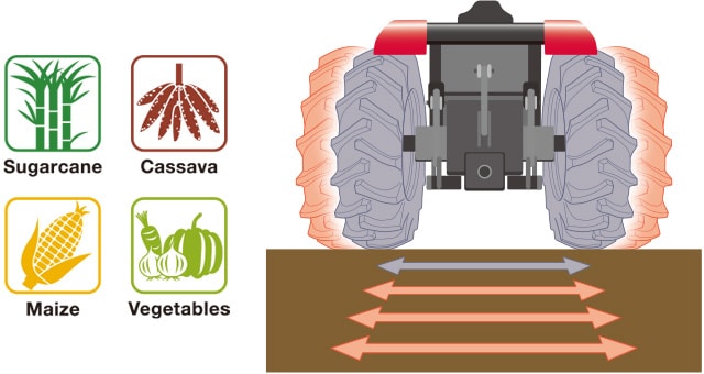 YM358R, L1 မော်ဒယ်တွင် ရှေ့တာယာနှင့် နောက်တာယာတို့အား လမ်းမောင်းခွင် အကျဉ်းအကျယ် ချိန်ညှိနိုင်ပြီး သီးနှံစိုက်ပျိုးရိတ်သိမ်းမှုပေါ် မူတည်၍ လမ်းမောင်းခွင် အကျယ်၄ဆင့်ထိ ချိန်ညှိနိုင်ပါသည်။