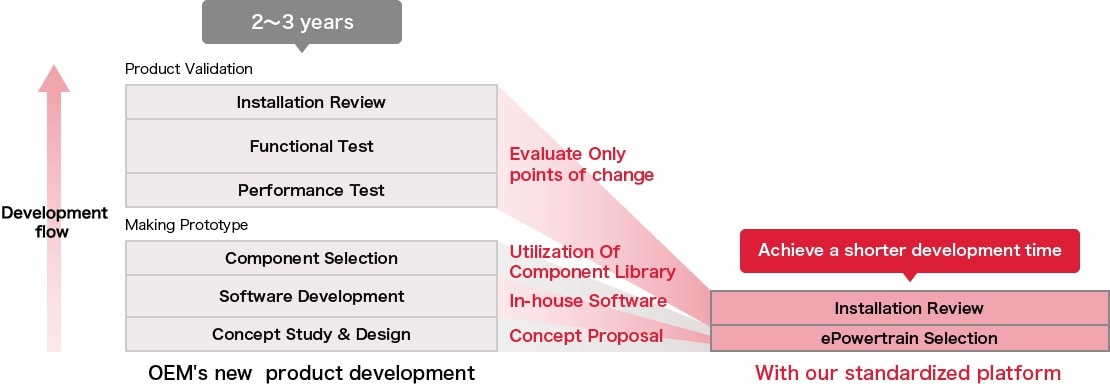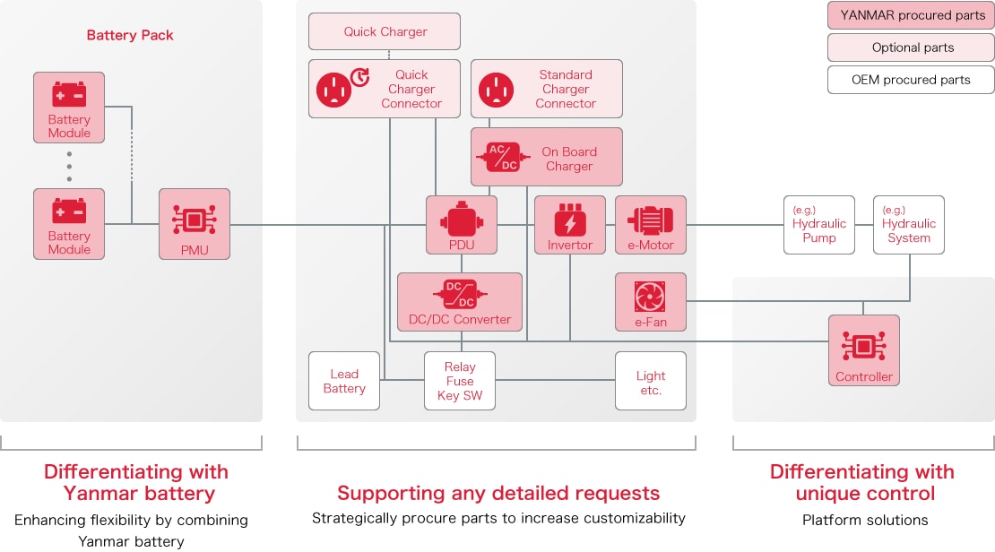 Yanmar has developed a standard platform for various industrial machinery, based on the experience it has accumulated over the years. By deploying and diversifying an electrification strategy based on this, it is possible to significantly shorten the development lead time compared to OEM's new product development.