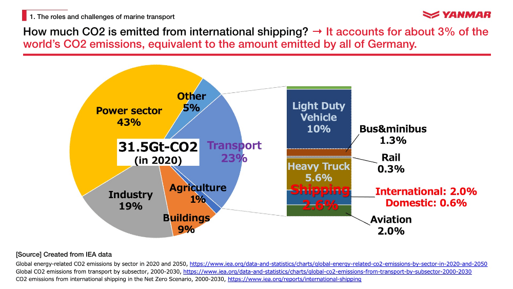 While the number of ships is increasing every year and transportation volume is expanding, CO2 emissions from marine transport account for approximately 2.6% of the total. That is on a scale equivalent to the volume emitted by all of Germany.