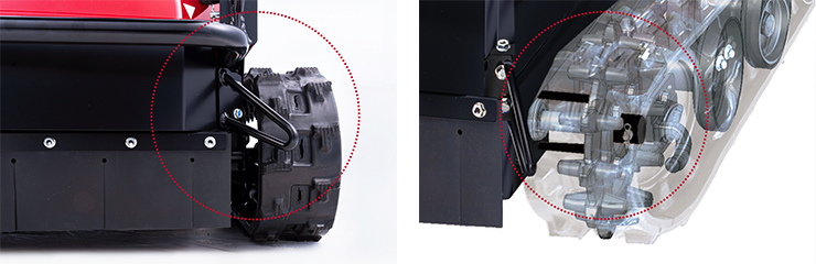 新たに草を刈取部へ取り込みやすくするデバイダを機械の前後に装備しました。また、クローラ・フレーム間には草の詰まりを低減する「からみません」を採用し、草がつまった場合でも簡単に草を取り除くことができます。作業中に大きく負荷がかかった場合は「快速制御」により自動的に車速を落とし、負荷が小さくなると元の速度まで復帰します。