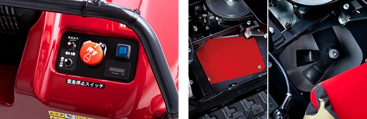 前後進・左右の移動操作ができる「緊急走行レバー」をエンジンスイッチ横に配置しました。手元に送信機がない緊急時や納屋内などでの近距離の移動時に、機体側で簡単に移動操作ができます。 また、ボンネット内のナイフ点検口のカバー色を変更したことで視認性が向上し、ナイフの点検・交換時のメンテナンスがしやすくなりました。